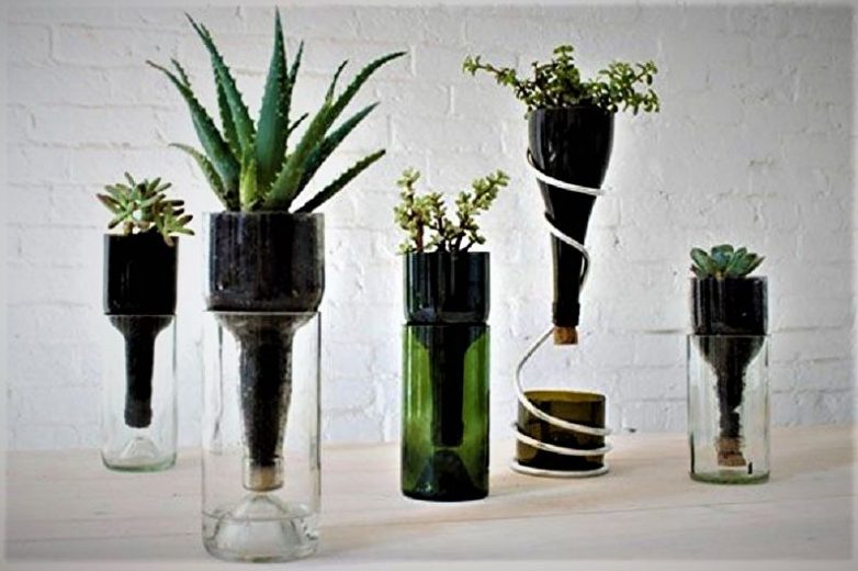 Для того чтобы бутылка стала уютным домом для комнатных растений, проделайте следующие манипуляции. Возьмите небольшую веревку и пропитайте ее спиртом, обмотайте вокруг стеклянной бутылки, разделяя ее пополам, и подожгите – таким образом вы получите две части. В верхнюю высадите растение, а в нижнюю налейте воду, либо оставьте ее пустой. Поставьте горлышко в получившийся стакан – оригинальный горшок готов.