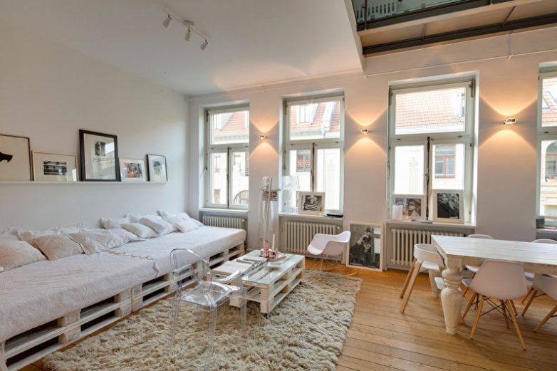 Мебель из поддонов отлично украсит помещение в стиле кантри или прованс — здесь использование грубых форм с провинциальным шармом считается важным требованием. Впишется она также и в рамки скандинавского направления, которое тяготеет ко всему натуральному.
