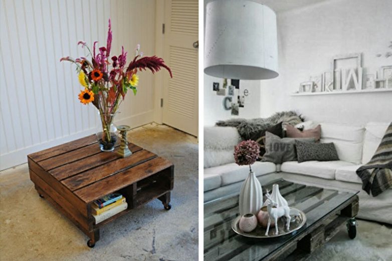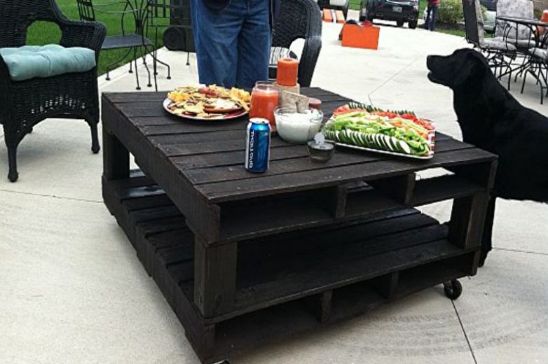 Если поставить друг на друга две паллеты, установив снизу четыре ролика — получится мобильный журнальный столик, который украсит современную гостиную. Поддоны в вертикальном положении могут образовать своеобразные ножки для столешницы. Таким образом можно сконструировать собственный стол патио.