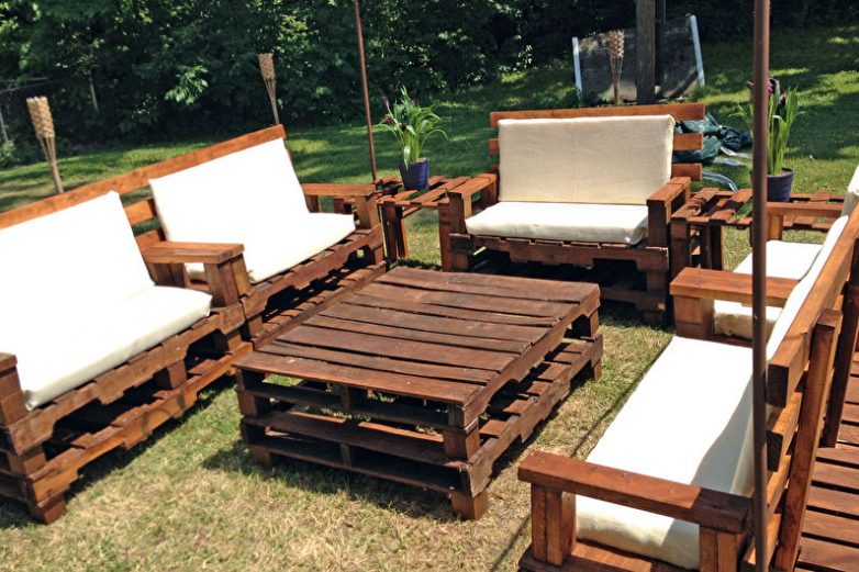 По такому же принципу создаются кресла, только они обычно ограничиваются одним блоком. Поддоны с деревянными ножками и спинкой — доступный вариант уличной скамьи.