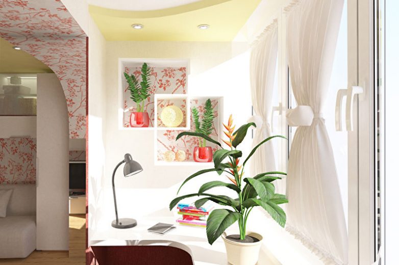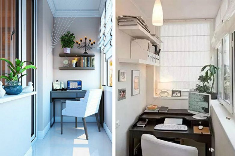 Из-за площади и непосредственной близости к окну такое помещение лучше проветривается, освещается, что положительно влияет на активность мозга. Однако большое количество света мешает работе за компьютером, поэтому на окна часто устанавливают жалюзи, реже — шторы, так как они визуально сужают лоджию.