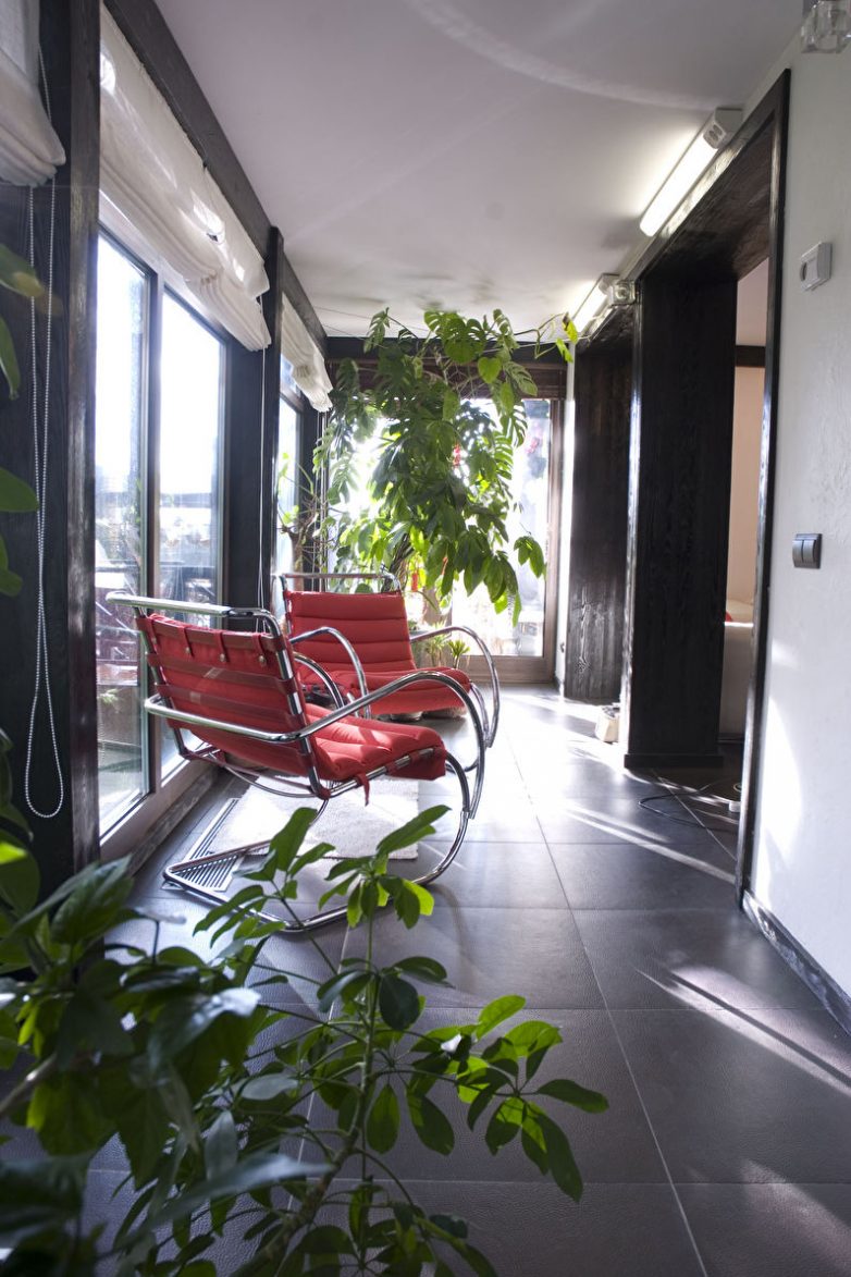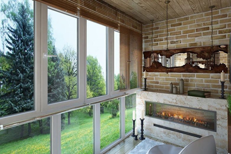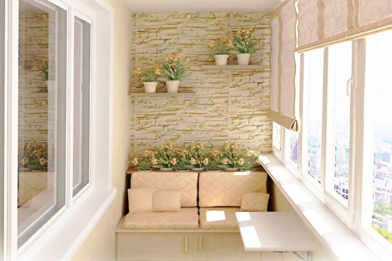 Остекленная лоджия предлагает множество вариантов дизайна и выступает в качестве дополнительной небольшой комнаты. Чтобы использовать ее в любое время года, необходимо позаботиться об утеплении стен, проведении электричества, но главное — об организации пространства. Некоторые хозяева предпочитают демонтировать стену между помещением и балконом, оставив разделяющую перегородку по бокам или повесив шторы с целью зонирования.