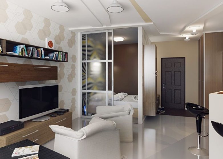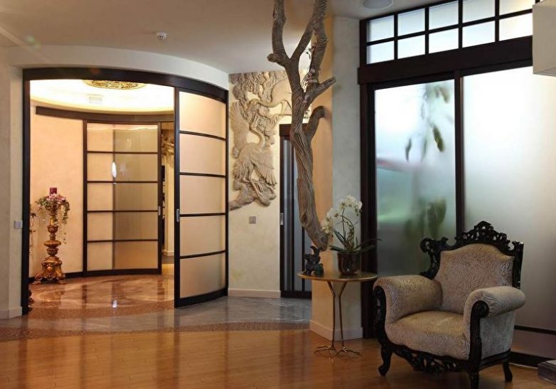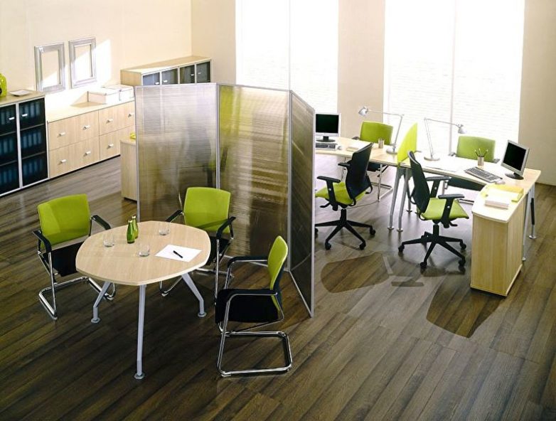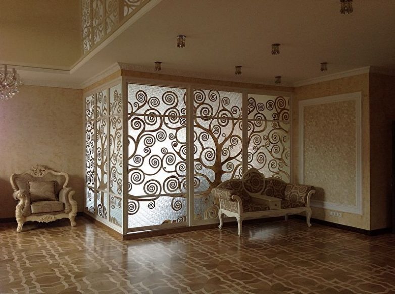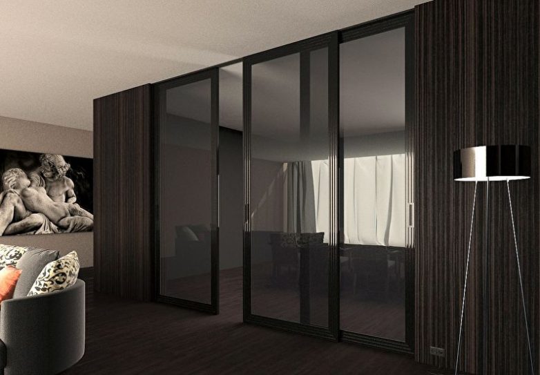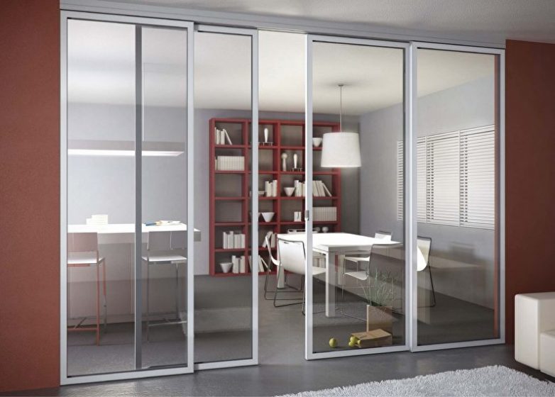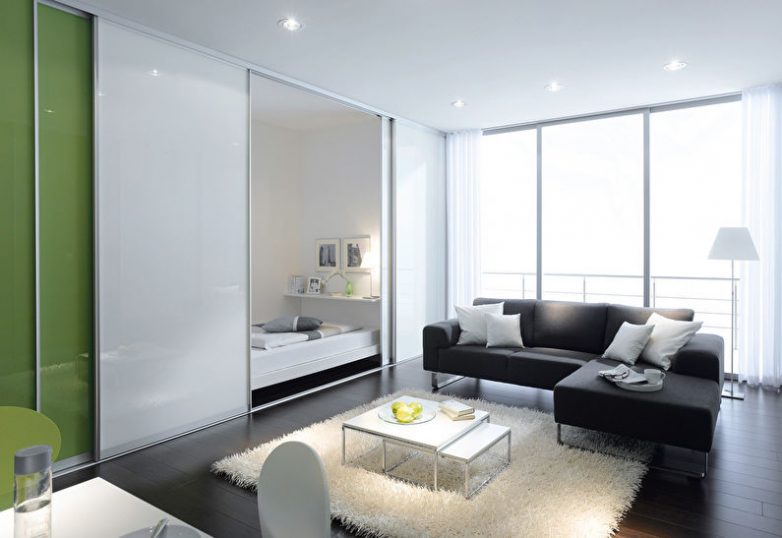 Раздвижные перегородки наряду с зонированием пространства выполняют функцию дверей, а при необходимости плавно убираются в сторону. В зависимости от механизма складывания — может быть либо система-купе, либо гармошка.