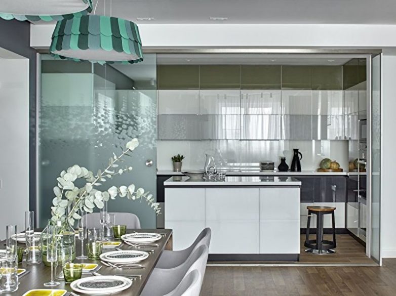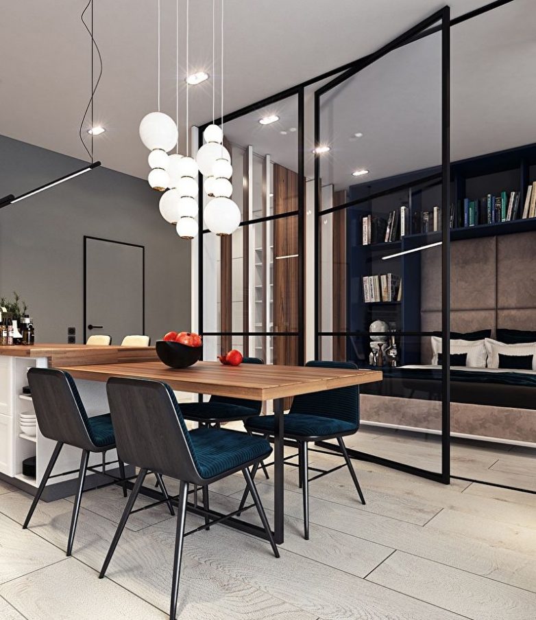 Стеклянные перегородки на кухне / в столовойМногие люди отказываются от совмещенной кухни-гостиной из-за опасений, что запах во время готовки будет распространяться по всей квартире. Герметичная перегородка из стекла с плотно закрывающейся дверью легко решает этот вопрос.Одновременно с этим кухня становится просторнее, смежная комната — визуально больше. А еще можно следить за происходящим на плите из гостиной, не отвлекаясь от просмотра сериала.