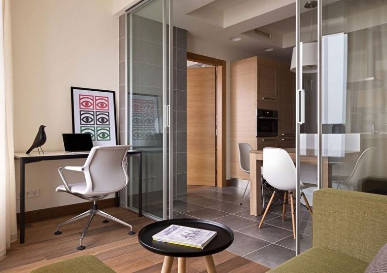 Чтобы беспрепятственно позволить лучам солнца проникать во все уголки жилья, были придуманы стеклянные перегородки. Одновременно с высокой светопроницаемостью, они значительно экономят место, делая квартиру просторной и стильной.