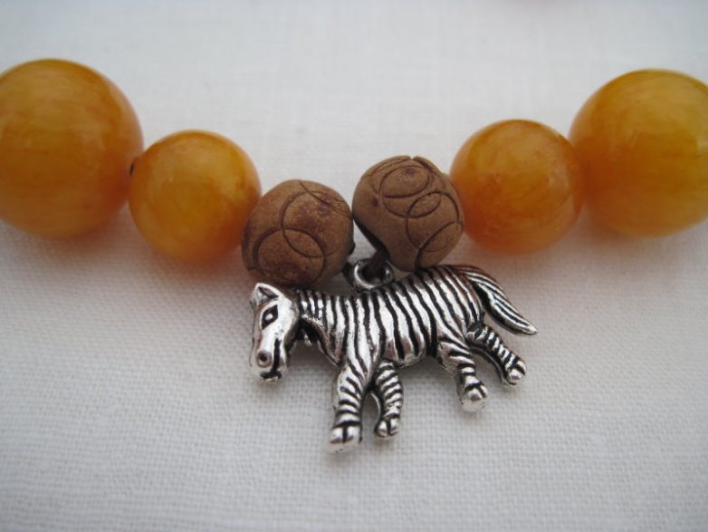Нанизываем бусины из натуральных камней-самоцветов и глиняные бусины в соответствии с эскизом. Посредине у меня металлическая подвеска-зебра.