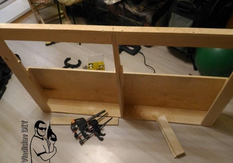Опять неучтенный момент. В проекте под поролоном планировалось использовать ДВП лист, но закрались сомнения в поперечной прочности, при перпендикулярных нагрузках. С помощью приблуды из Китая «косой шуруп» (снобы могут смотреть в сторону Kreg) разместил еще несколько бывших ламелей в стык.