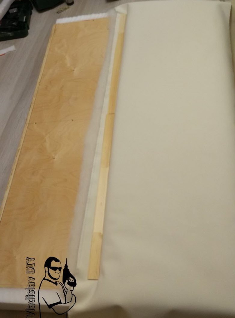 Чтобы не было шва и был виден четкий перегиб: верхнюю часть обивки прибивают чуть с запасом, далее нижний кусок переворачиваем лицевой стороной к лицевой стороне верхнего и прибиваем через рейку, вместе с верхним. Потом нижний переворачиваем и получаем красивый перегиб. Фото, к сожалению, нет (но на видео всё будет)