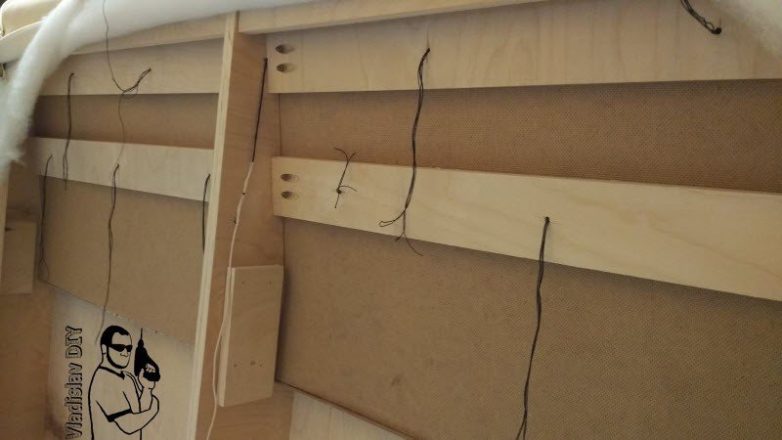Итак, вернёмся к кровати. Пуговицы вытягиваются за веревку и прибиваются степлером. Как показала практика, надо использовать не тонкие нитки как на фото, а толстые и прочные. Одна из пуговиц оторвалась и пришлось идти в хозмаг за нормальными нитками. Передал все! И для надежности, около каждой нитки вкрутил саморез, обвязал нить вокруг и только потом прибил степлером.