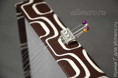 Натягиваем шестую нить основы и не забываем проводить ещё через отверстия обеих частей замочка. Седьмая нить натягивается обычно, восьмую снова проводим через замочек, девятую и десятую натягиваем как обычно.