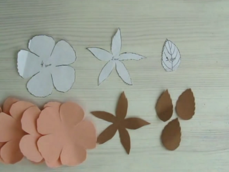 Что понадобится для работыКонечно же сам фоамиран.В нашем случае будем использовать два цвета: персиковый пойдёт для создания бутона и коричневый, для листье; кусочек фольги; шаблоны лепестков и листьев; флористическая проволока; утюг, термопистолет и ножницы.Процесс создания розы из фоамиранаПервым делом, используя бумажные шаблоны вырезаем необходимое количество лепестков и листьев. Лепестков понадобится четыре штуки: три листочка и один чашелистик(отдельная наружная часть чашечки цветка, зеленого или любого другого цвета).