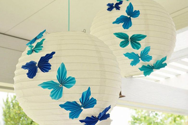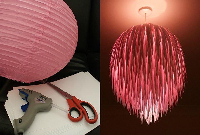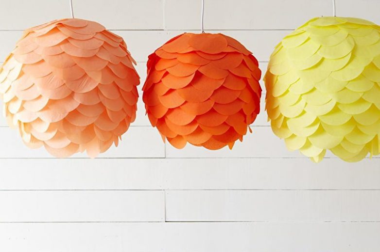 Если у вас дома нашлись бумажные фонарики, не спешите использовать их в качестве самостоятельного плафона, ведь это — отличная основа для других экспериментов.Его можно обклеить всем, чем угодно, но чтобы избежать самодельного вида — предлагаем украсить шар небольшими бумажными чешуйками или длинными «перышками», которые будут изящно свисать к низу.