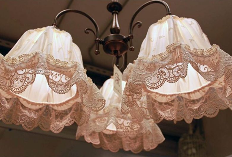 Пришедший к нам из далеких французских деревень, прованс предпочитает простую уютную эстетику натуральных материалов, цветочных узоров, а также светлых оттенков. Примерно таким должен быть и плафон для люстры.Уместно выглядят изделия из ткани или кружева округлой формы. При небольшом уровне мастерства можно облагородить стеклянный колпак декупажем, тем самым сэкономив деньги — ведь, несмотря на свою простоту, аутентичный прованс предполагает значительные затраты при обустройстве.