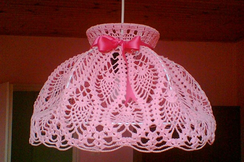Менее хаотично выглядит такое решение из ниток. Главные условия для его изготовления — умение вязать или наличие бабушки, которая любезно свяжет вам салфетку. Готовое изделие необходимо расположить на любую основу — металлический каркас, прозрачную емкость, китайский шарик. Аналогично с первым вариантом, можно закрепить абажур на воздушном шаре с помощью клея.