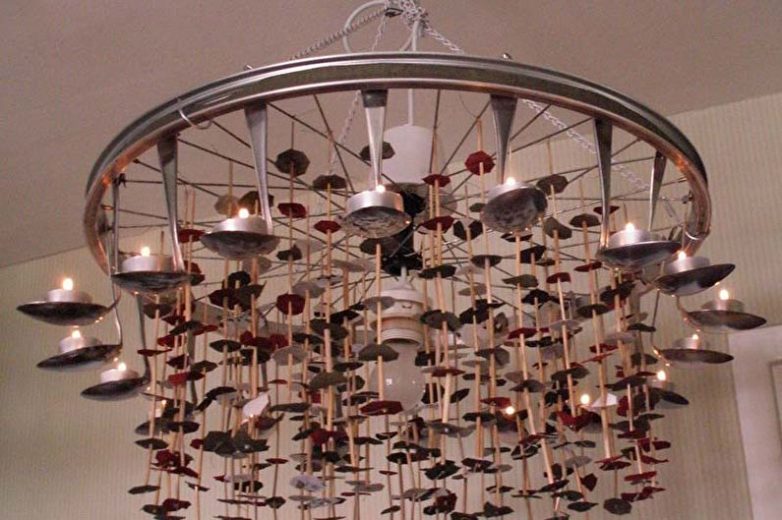 Достаточно необычные решения для люстр предлагают также металлические изделия. К счастью, изготавливать самостоятельно их не нужно, так что особых навыков работы с металлом от вас не потребуется. А вот эффектный внешний вид обеспечен в любом случае.Кухонные приборы