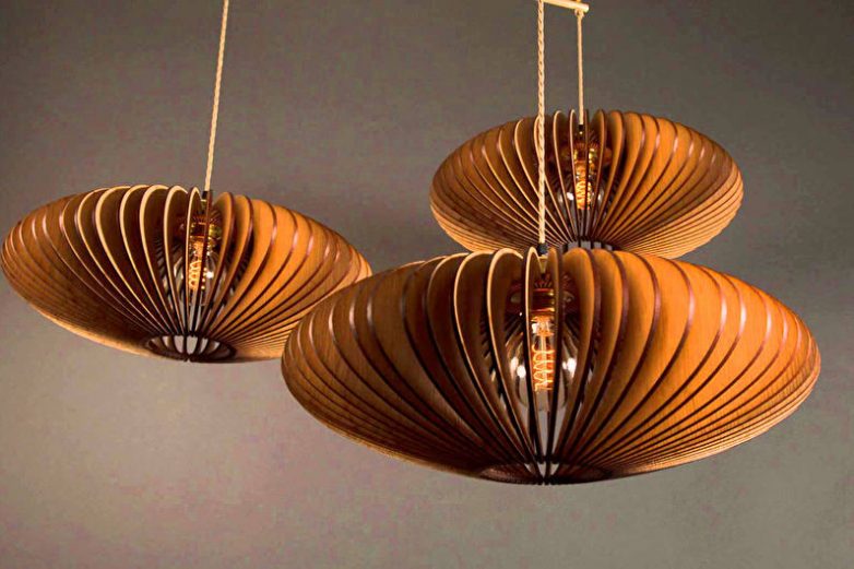 В-третьих, люстра должна хорошо освещать помещение, не затемняя его. Однако для некоторых интерьеров больше подойдет приглушенных свет: в детской, спальне или гостиной для интимной атмосферы. В таких случаях можно проявить фантазию, изготовив абажур, создающий световые узоры в комнате. Вы, как автор, можете воплотить любое свое решение — а это, наверное, главное преимущество самодельных плафонов.