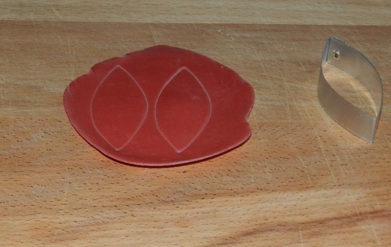 Приступим к изготовлению листочков. У меня нет специальной формы для пуанссетии, но это не беда. Раскатаем красную глину, вырежем обычным каттером листики можно сразу четыре, но я делаю попарно.