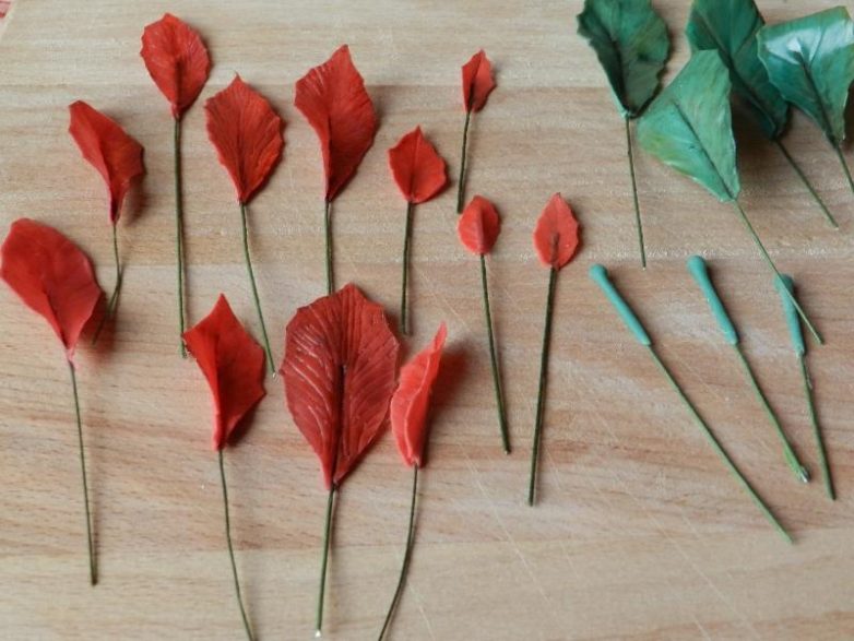 Я запланировала украшение для композиции, поэтому буду делать его относительно плоским, словно лежащим на блюде. Для моей задумки достаточно будет 16 листиков, преимущественно красных, из зеленых я хочу сделать только один уровень-основу.