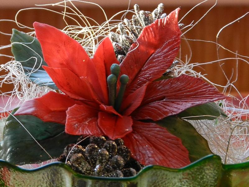 Если вы решили сделать пуанссетию для вазы, и вам нужно, чтобы она была высокая, тогда при сборе цветка каждую новую четверку листьев крепите на некотором расстоянии от предыдущей. Промежутки между ними аккуратно маскируйте зеленой глиной так, чтобы получался ствол.