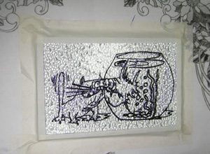 Проверяем работу на отсутствие мелких незакрашенных участков.Переклеиваем стекло с листа с трафарета на белый лист, чтобы лучше видеть работу.