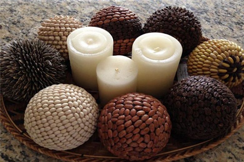 Это не совсем топиарий, но изготавливают кофейный шар аналогичным способом. Различие состоит в отсутствии ствола, да и по форме он совершенно не будет напоминать дерево. Можно комбинировать в композиции зерна кофе с семечками, бобовыми. Стильный вариант получится, если разместить несколько шаров в красивом стеклянном блюде или вазе.