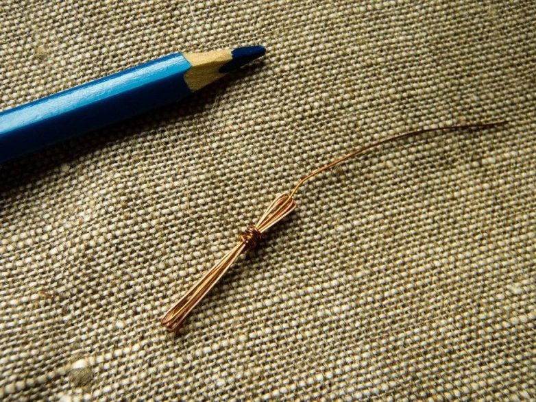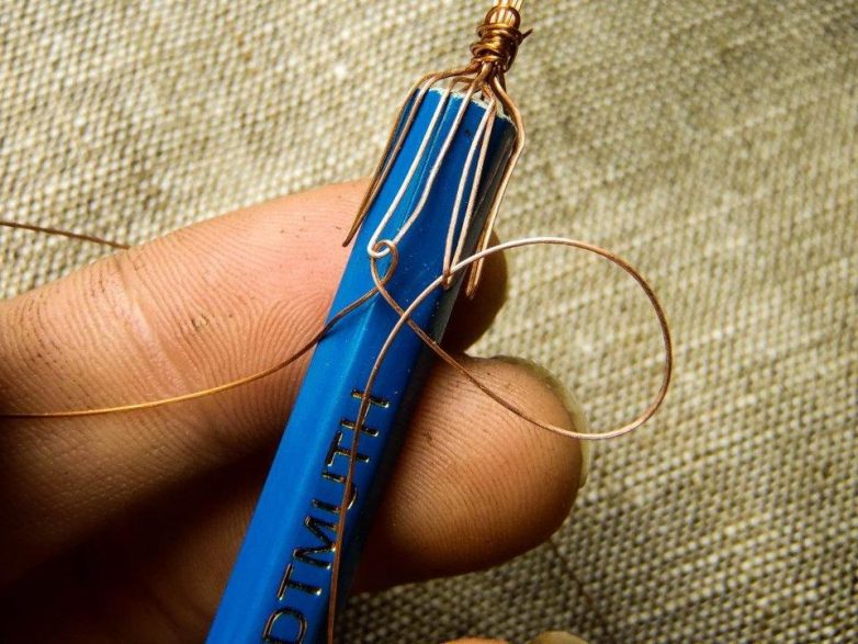 Этот «цветочек» загибаем вокруг карандаша. Отрезаем еще кусочек проволоки, около 70 см длиной, и начинаем плетение. Оставляем небольшой свободный конец и делаем петлю вокруг одного из «лепестков».