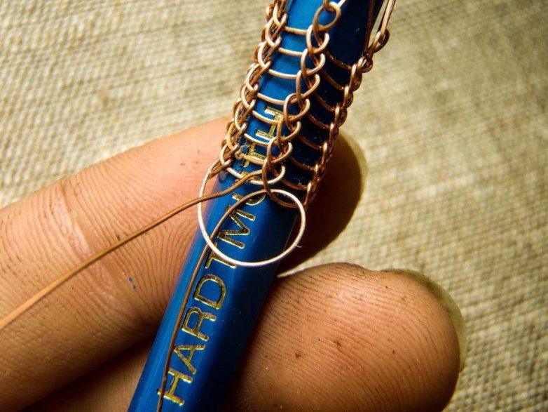 Теперь нужно нарастить конец проволоки, чтобы можно было плести дальше. Отрезаем еще кусочек и заводим его под один из вертикальных рядов петель.