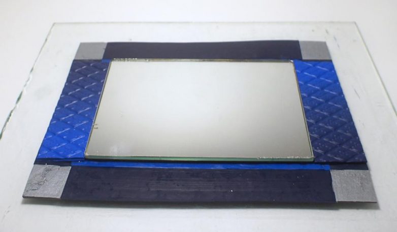 Остывшую заднюю часть рамки кладем рисунком вниз. Затем ровно располагаем зеркало. Смазываем жидкой пластикой выступающие части рамки, особенно в тех местах, где соединялись элементы задника.
