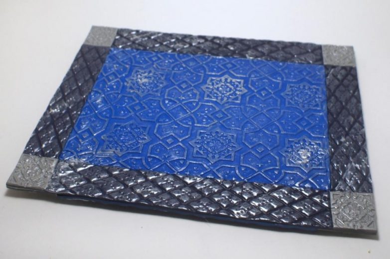 Я использую два вида текстур. Для центральной ярко-синей части и угловых элементов одну, для боковых узких частей другую. Угловые квадратные элементы сделаны из серебристой пластики, боковые полоски — из темно-синей. Их расположение видно на фото. Необходимо тщательно прижимать все элементы друг к другу, тогда после запекания они будут хорошо держаться.