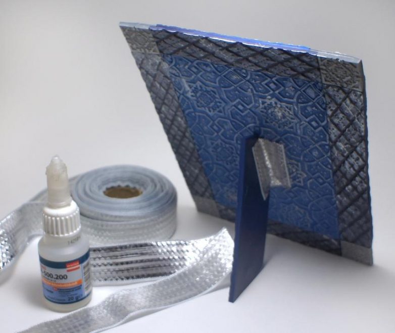 После того как краска высохнет, закрепляем ножку. Проще всего это сделать с помощью широкой ленты подходящего цвета и клея типа «космофен». Ножку перед приклеиванием необходимо также подрезать для нужного угла наклона всего зеркала.