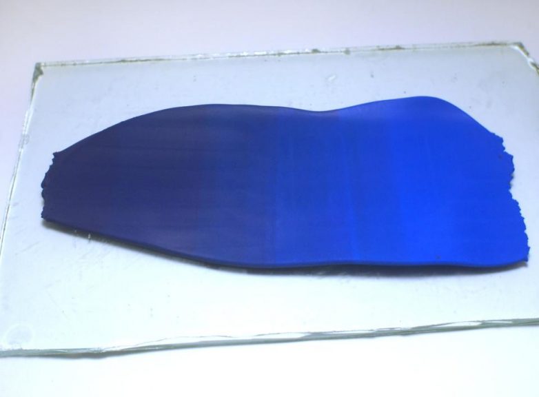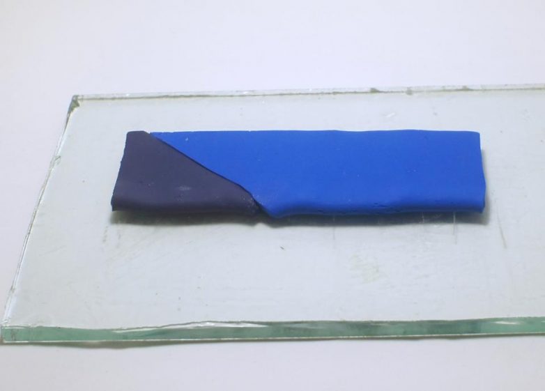 Так как темно-синяя пластика очень сильно влияет на цвет светлой, что характерно для всех темных цветов полимерной глины, то ярко-синего цвета нам понадобится побольше. Обрезаем их и складываем так, как показано на фото.