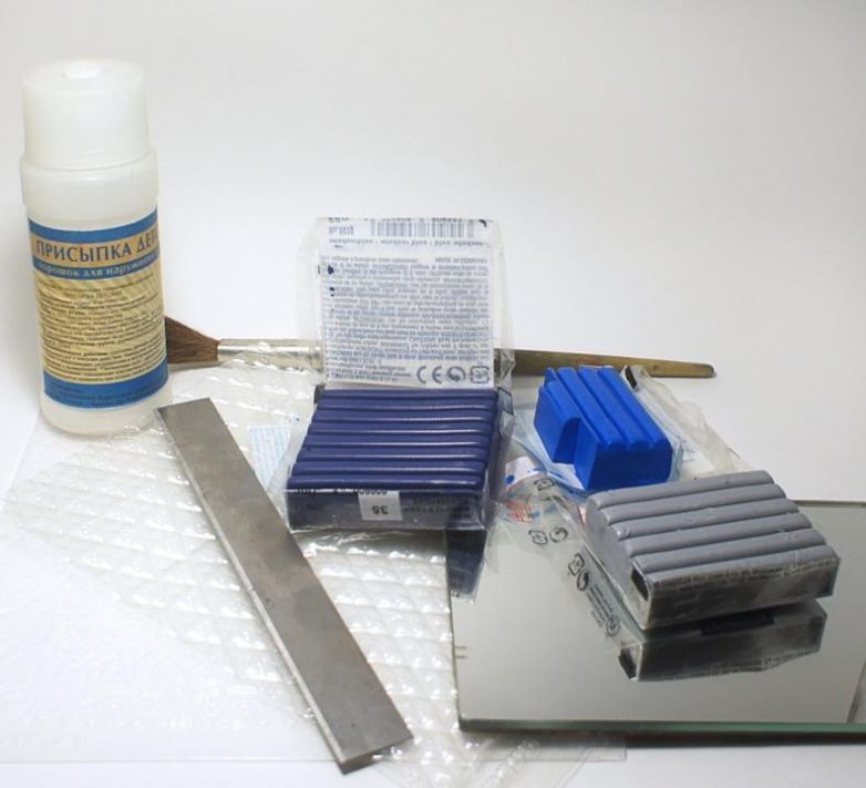 Для основания рамки нам понадобится достаточной большой и толстый пласт полимерной глины. Можно использовать один цельный, но он должен выходит за границы зеркала примерно на 3 см с каждой стороны. Если вы сделаете таким же образом, как и я, то есть возьмете нескольких кусочков, то центральный большой элемент должен быть больше самого зеркала, хотя бы на 0,5 см.