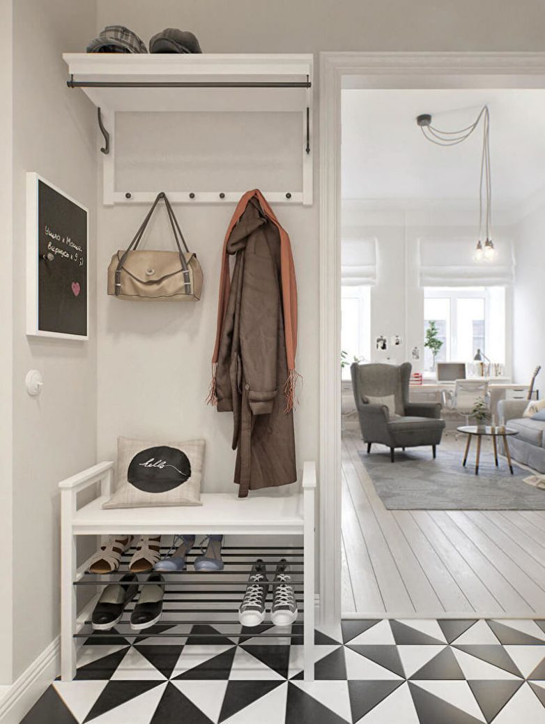 Беленое дерево, этническая плитка пэчворк и характерные напольные коврики разбавят суровый дизайн прихожей, создавая уютный обжитый вид.
