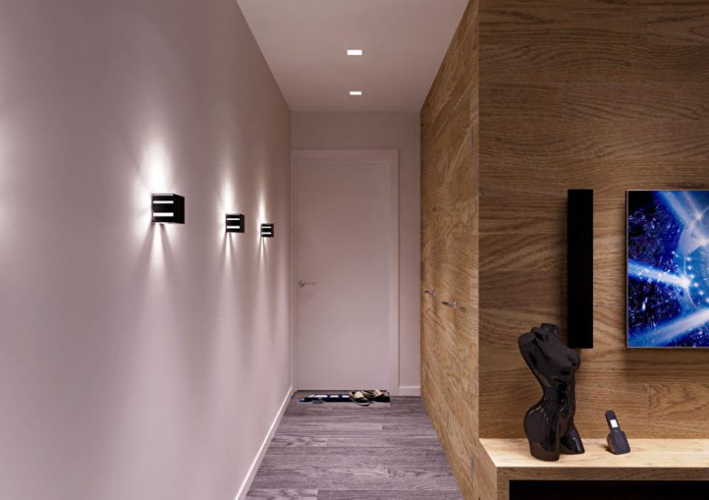 баритной прихожейЧтобы из-за отсутствия окон прихожая не казалась мрачной, в ней следует предусмотреть хорошее освещение. Это могут быть точечные светодиоды или неоновая лента по периметру и небольшая припотолочная люстра (а лучше — несколько) в центре; два-четыре бра в виде фонариков или других подходящих по стилю форм; угловые прожекторы.Пол можно подсветить люминесцентными элементами или встроенными под ударопрочное стекло LED-лампами — это поможет не спотыкаться в темноте.