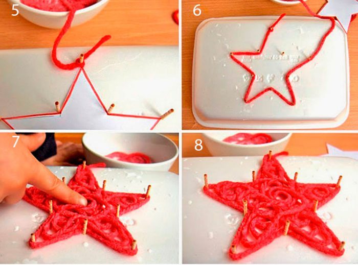 Пропитайте нитки клеем.Нарисуйте на бумаге звёздочку, ёлочку, либо что-то другое и вырежьте шаблон.