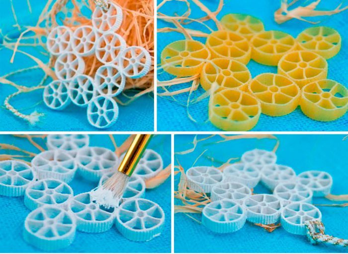 Вам понадобится: макароны подходящей формы, краска, кисточка, клеевой пистолет, ленточка для подвешивания.