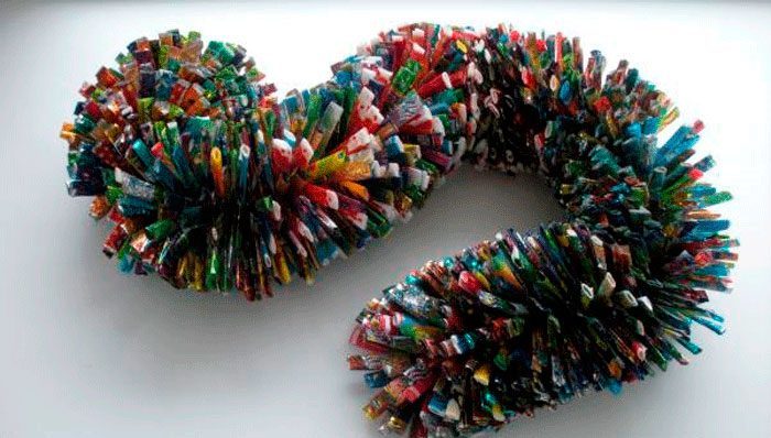 Возьмите фантик сделайте из него бантик, либо разгладьте его. Гирлянда из бантиков смотрится оригинально, а из прямоугольников более объёмной.