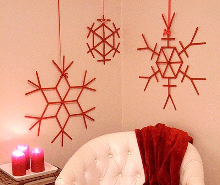 Очень креативно смотрятся такие яркие снежинки на стенах. Сделать их достаточно легко, только вам нужно иметь одинаковые деревянные палочки от мороженого минимум 24 штуки. Можно их насобирать либо заказать в интернет-магазине по очень доступной цене.