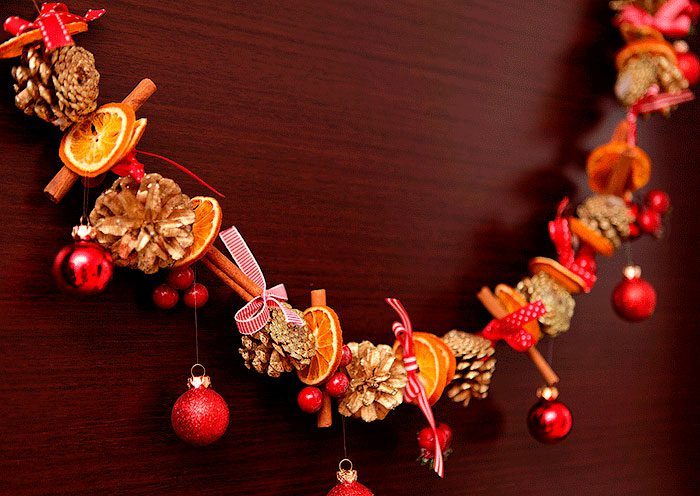 Прикрепите гирлянду.Такая креативная гирлянда не только украсит ваш дом и удивит гостей, а и подарит чудесный аромат цитрусовых наполненный витамином С, который так необходим в зимний период.