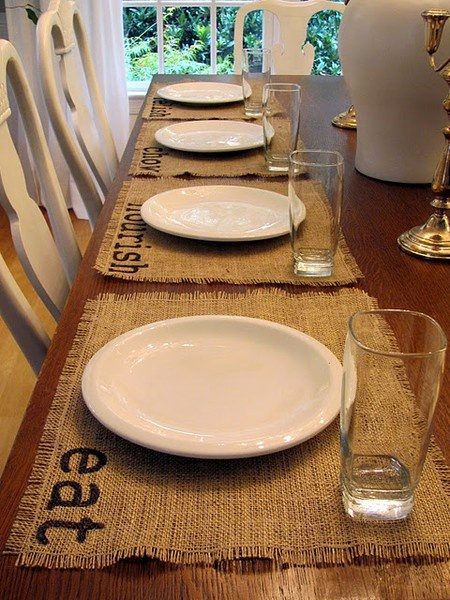 Мешковина может также использоваться в сервировке стола. Особенно эта идея понравится любителям интерьеров в деревенском стиле. Из мешковины можно сделать скатерть и салфетки, а также ей можно декорировать вазочки и подсвечники из стекла.