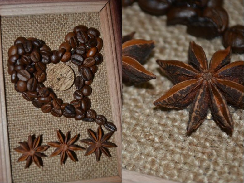 Внизу картины размещаем три звездочки бадъяна. Фиксируем их с помощью клеевого пистолета. Над ними будем делать объемное сердце из кофейных зерен.