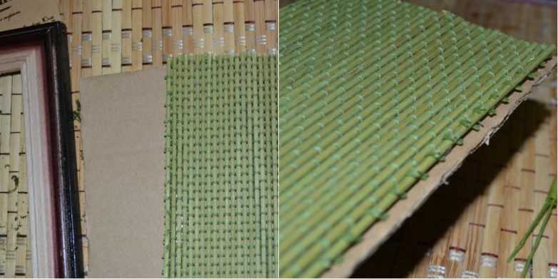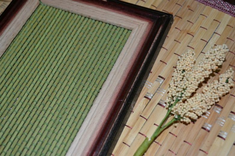 Фоном данной картины послужит бамбуковый коврик. Мы вырезаем нужный кусочек, клеем на картон и крепим к рамке.