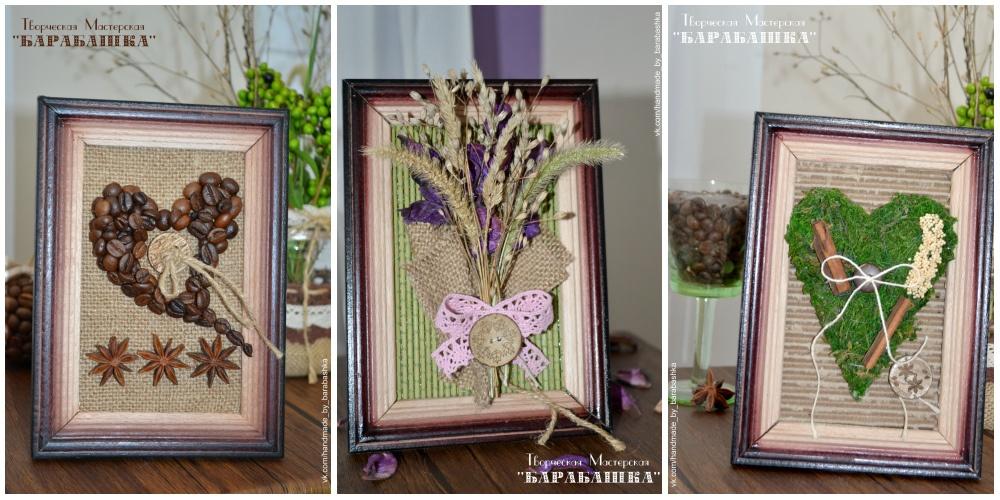 В этом мастер-классе прилагаем сделать три эко-картины. Основными элементами, которых будут дерево, кофейные зерна и натуральный мох, сухоцветы и пряности, ткани, нити и кружево из натуральных материалов; основными цветами станут: бежевый и коричневый, цвета травы и дерева, бледные природные цвета сухоцветов.