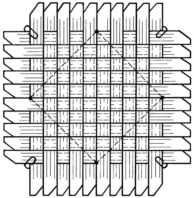 Заложите полотно 10×10 лычек правой стороной материала наружу, сверяясь с рис. 1, проверьте плотность, очините и пронумеруйте концы лычек, около цифр 6 и 9 поставьте внизу заметные точки.