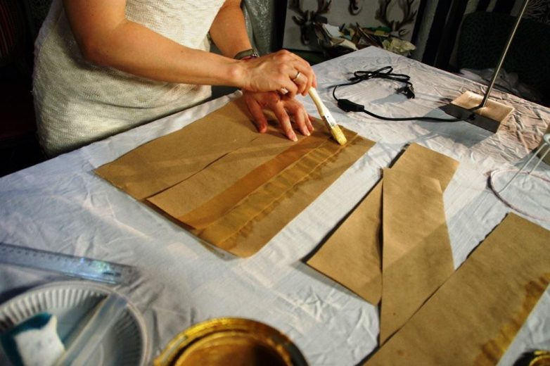 Сначала нарезаем листы бумаги на вытянутые полоски, шириной 10-15 см, для декора берем золотую краску и окрашиваем бумажные полоски вдоль шириной примерно 3 см. С помощью обычной губки для посуды можно сделать фактуру на окрашенной поверхности.
