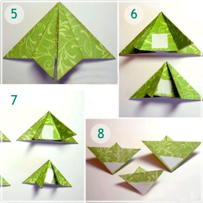 Заправьте 2 противоположных треугольника вовнутрь.Прижмите получившийся треугольник к поверхности и отметьте условно центр.