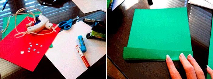 Возьмите зелёный картон, разрежьте пополам и сделайте гармошку на одной из половин. Расстояние каждой складочки гармошки должно быть 1-2 см.