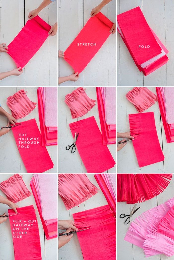Подготовьте всю бумагу таким же образом.Прикрепите гирлянды к потолку с помощью скотча, либо развесьте на леску.