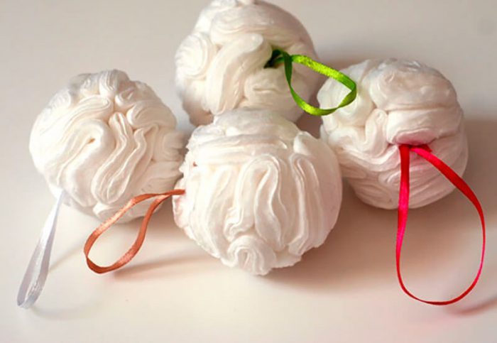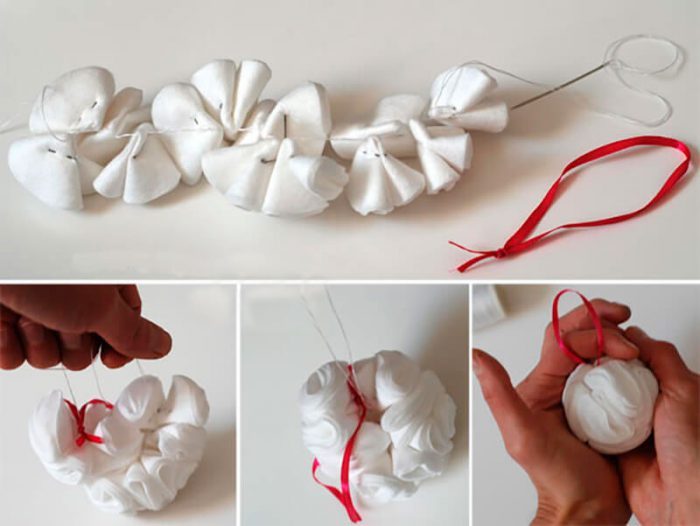Вам понадобится: 15 ватных дисков для одного шара, белая нитка с иголкой, степлер, атласная ленточка для подвешивания.