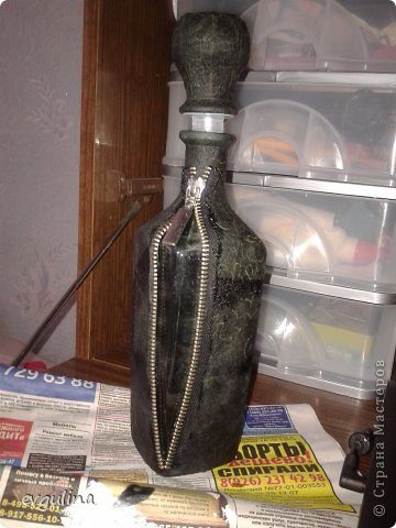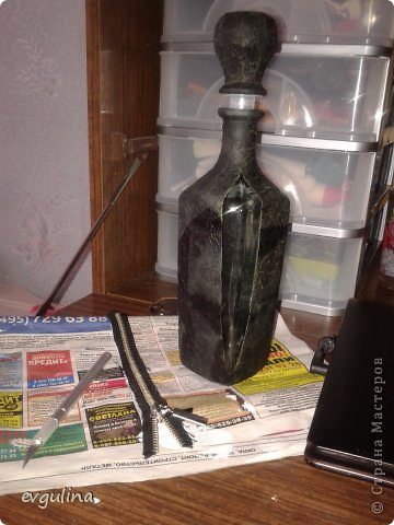 Обклеивала графин бумагой (я использую туалетную бумагу). Что бы клей стал черным смешала его с чернилами.